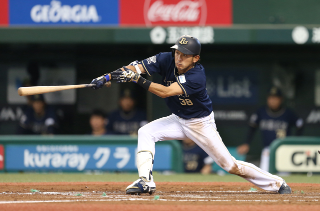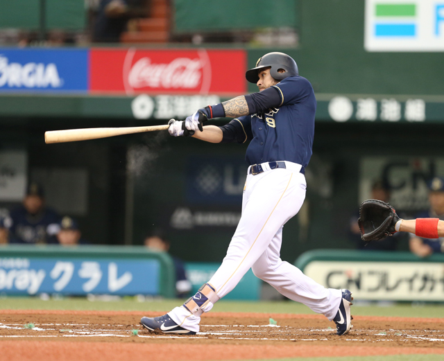4番 中村 左安 ランナー1,2塁 内角低めのカーブをレフトへ先制タイムリーヒット! 西1-0オ ![]() 1