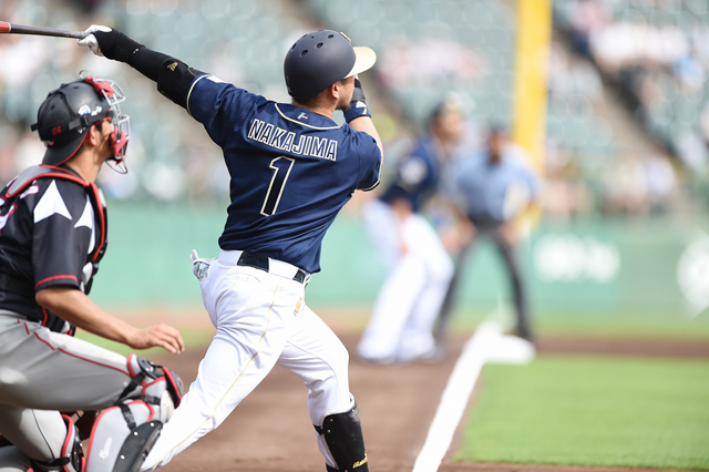 1番 伊志嶺 左安 内角低めのストレートをレフトへ打ってヒット 1塁 |