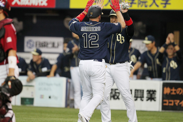 勝ち越し弾を放ち、中島選手とハイタッチをするマレーロ選手!