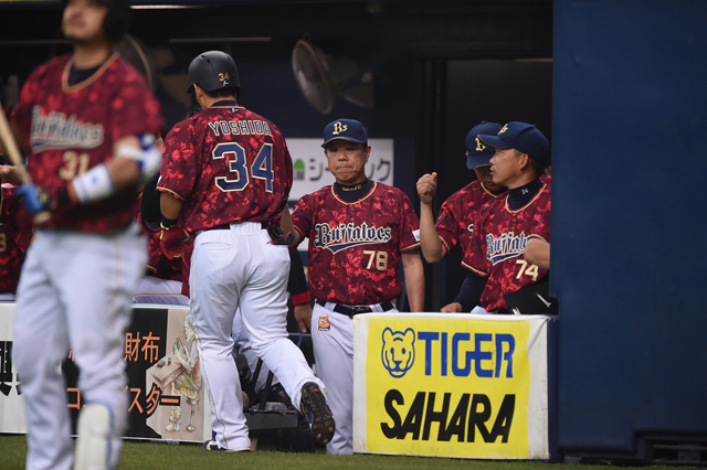 先頭打者弾を放ち、ベンチで歓迎される吉田正選手!