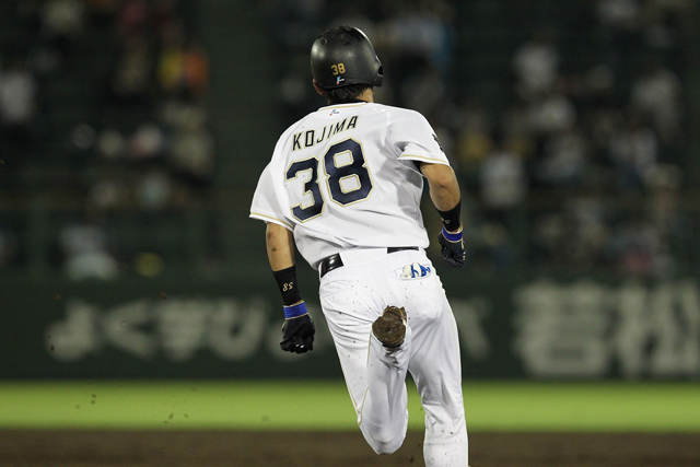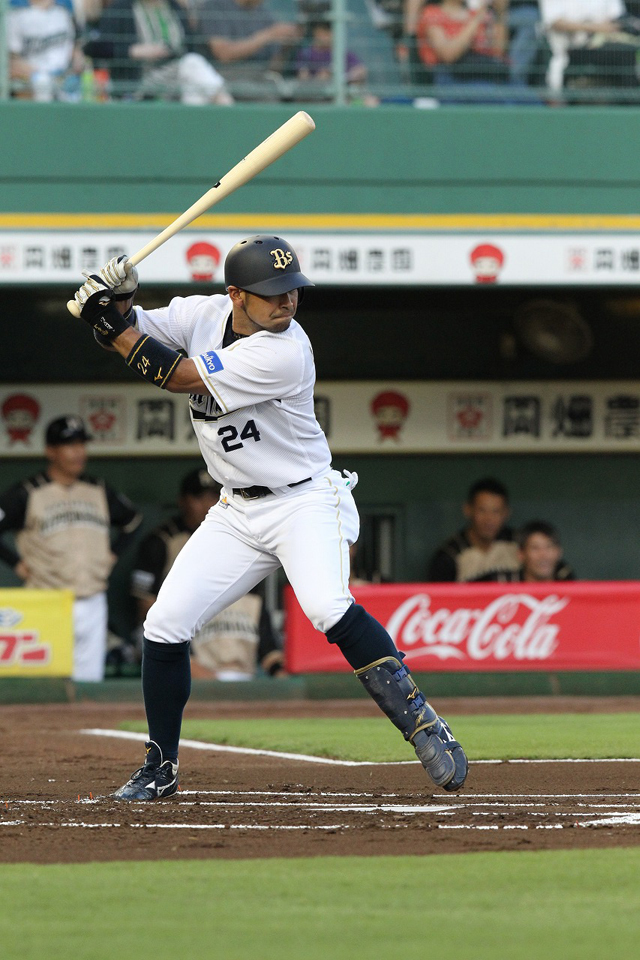 8番 伊藤 左安 ランナー2塁 外角低めのフォークをレフトへタイムリーヒット! 1塁 オ2-0日 ![]() 2