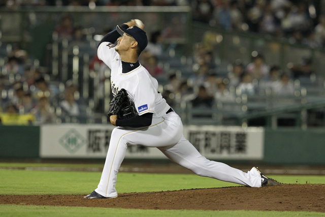 この回を3者凡退に片付け、6回1失点に抑えた金子千尋投手!