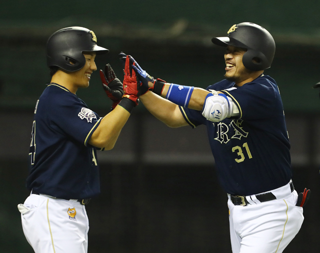 代打で逆転ホームランを放ち、吉田正選手とハイタッチする小谷野選手!