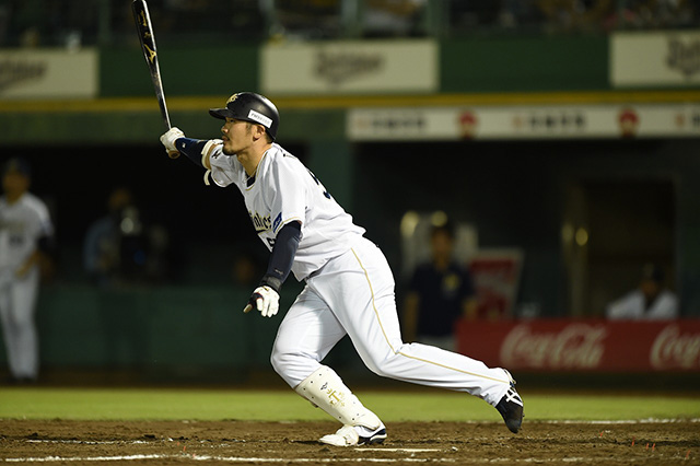 代打で出場の宮崎選手が右安打で出塁する