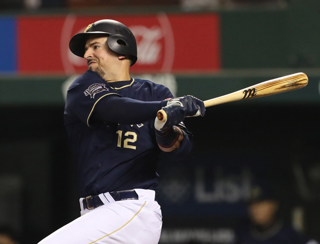 5番 栗山 四球 フォアボールを選ぶ 1,2塁 |