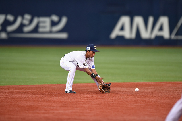 投手 金子千尋 5番 レアード 遊ゴロ 外角のカットボールを打つもショートゴロ 1アウト |