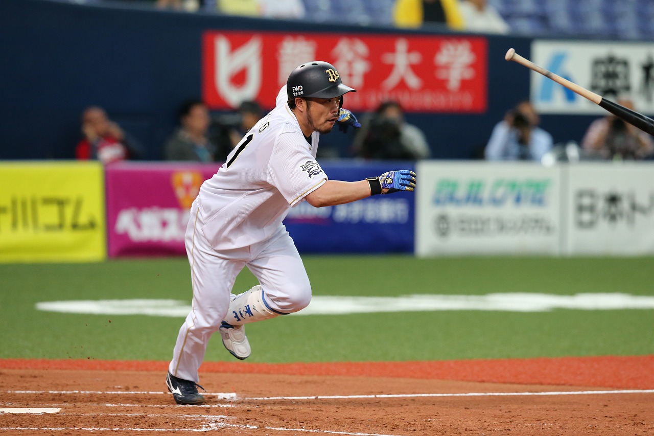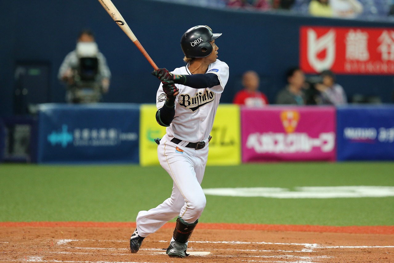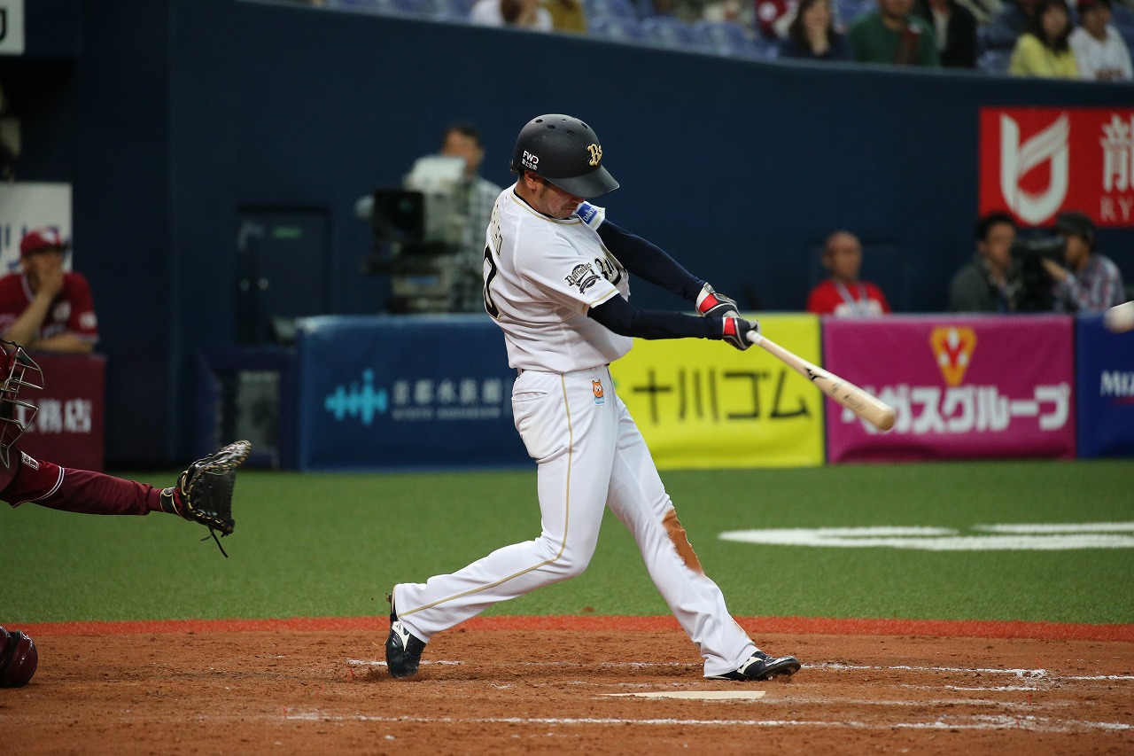1番 宗 左2 ランナー2,3塁 外角のストレートをレフトへ逆転タイムリーツーベース! 2塁 オ2-1楽 ![]() 2