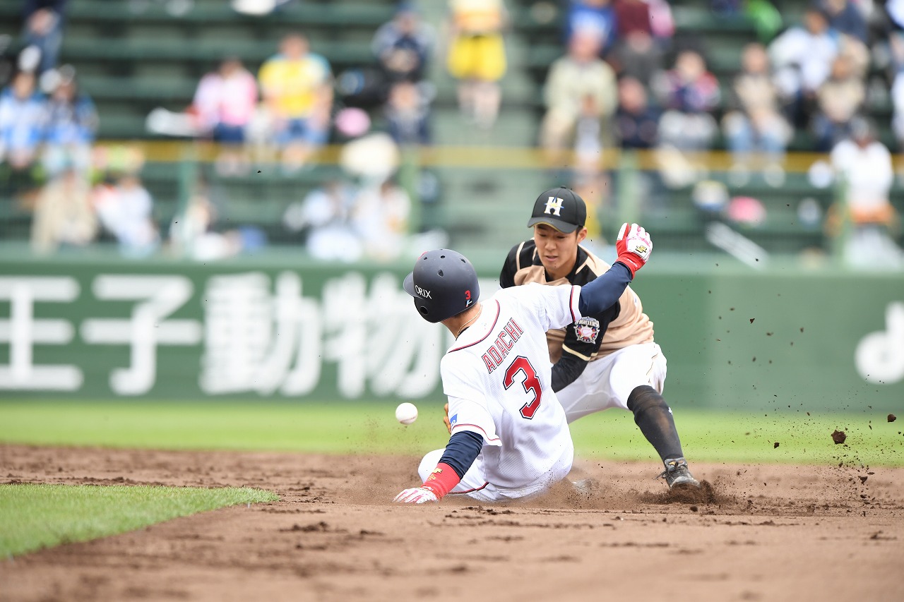 若月選手の先制打で生還した伏見選手とマレーロ選手!