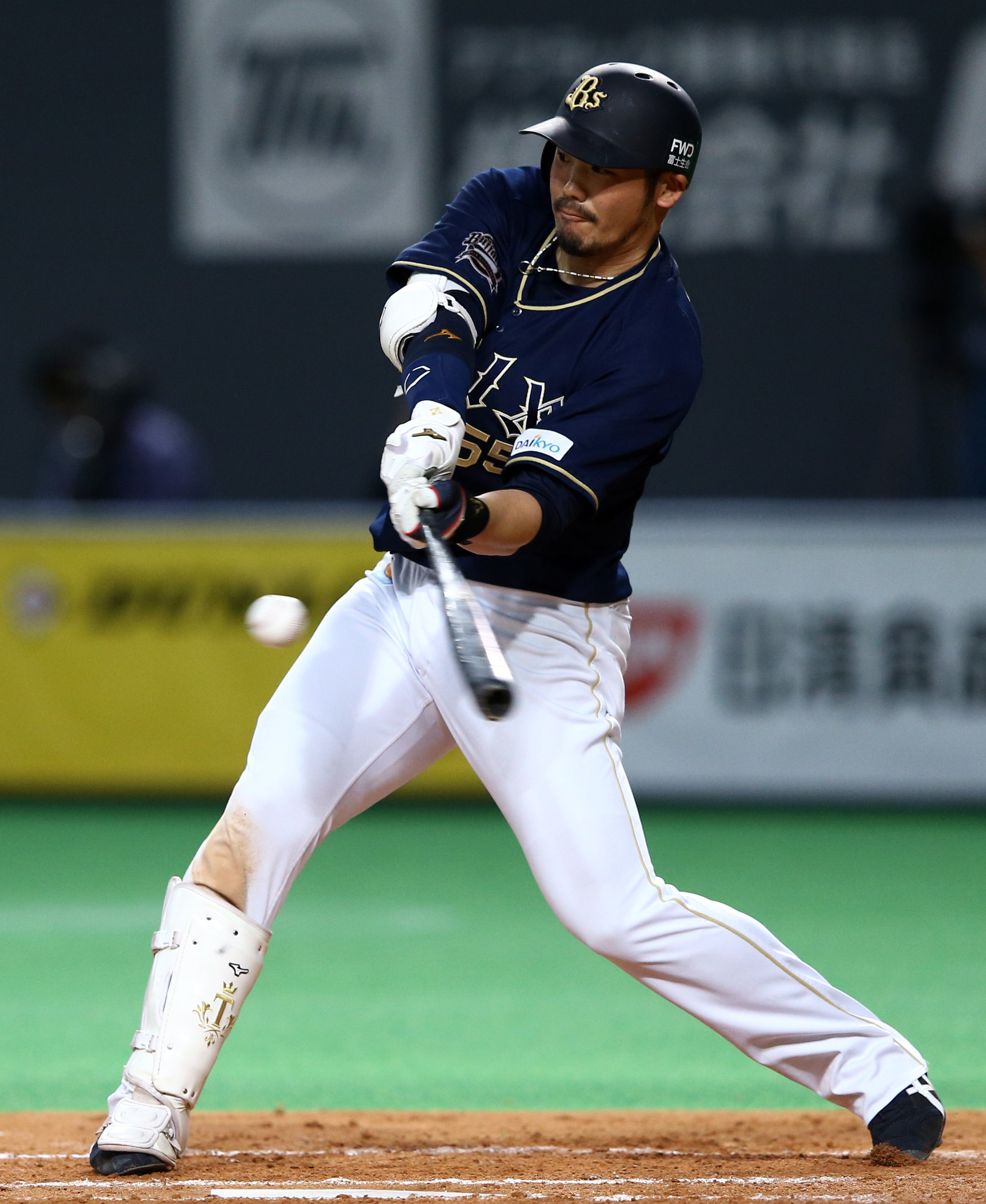 この回の先頭打者としてシングルヒットで出塁したT-岡田選手!