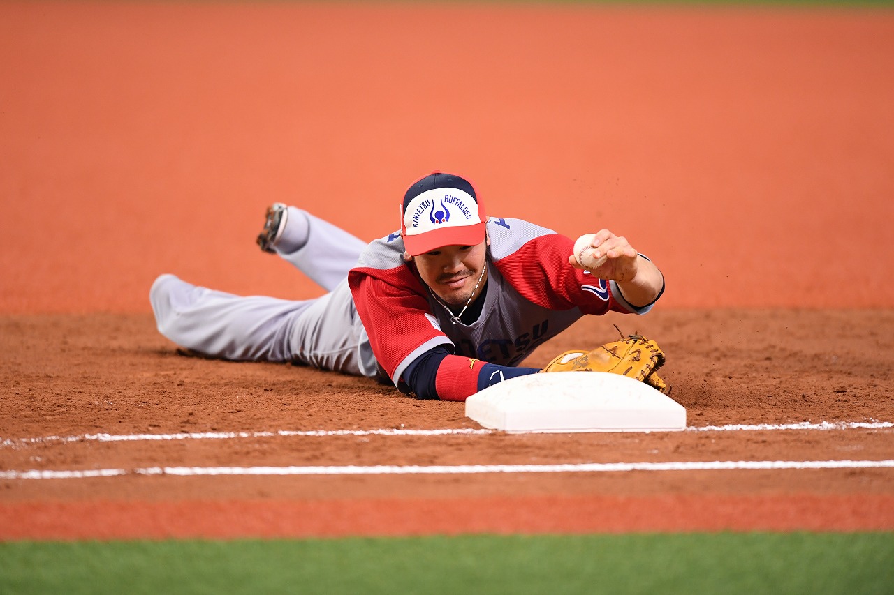 一塁ベースに飛び込みアウトにしたT-岡田選手!