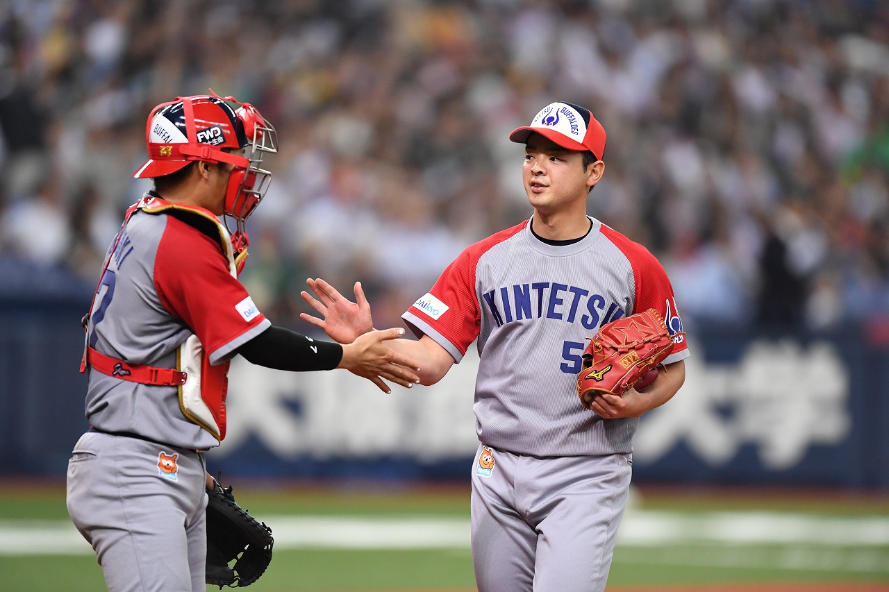 2番手として打者2人を打ち取り、若月選手とタッチする黒木投手!