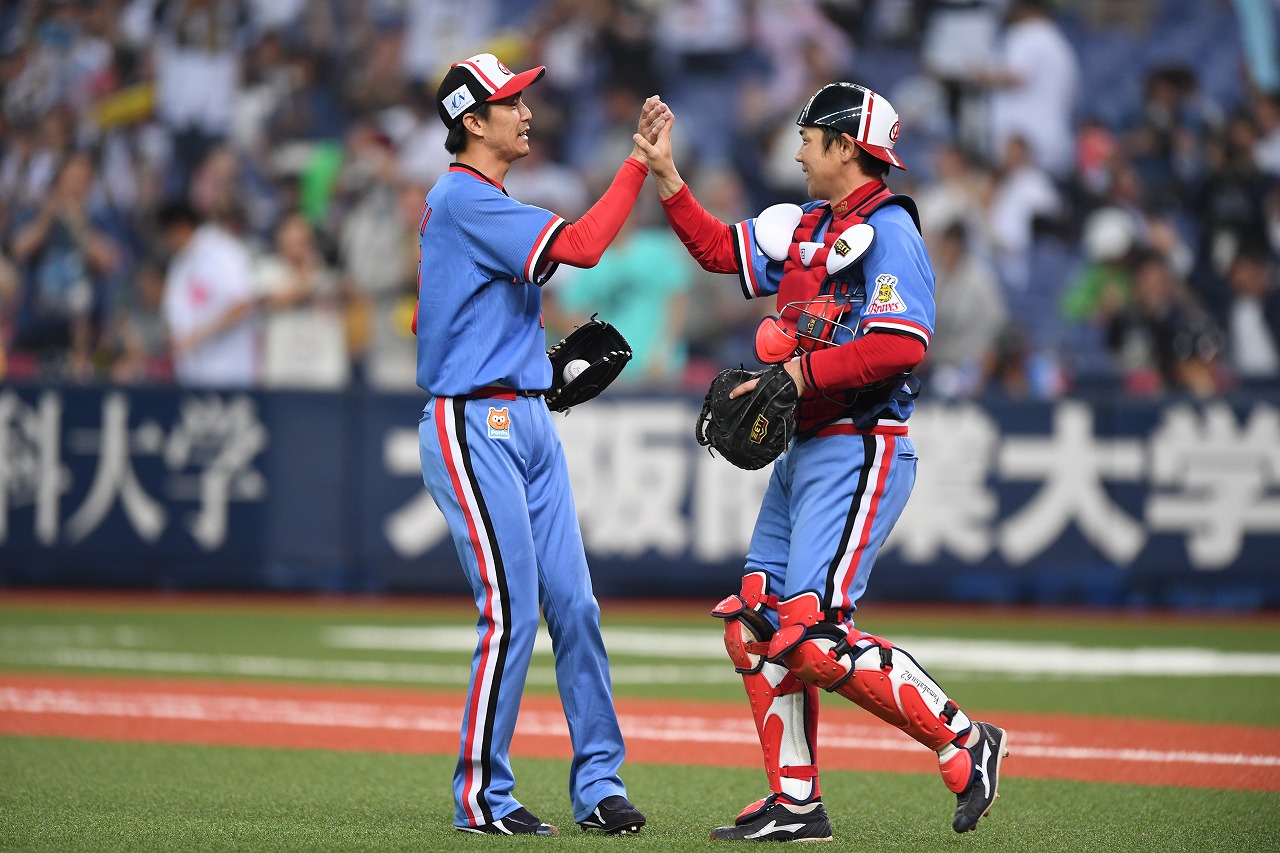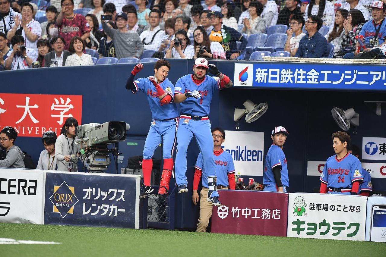 勝ち越し弾を放ち、安達選手といつもの儀式!