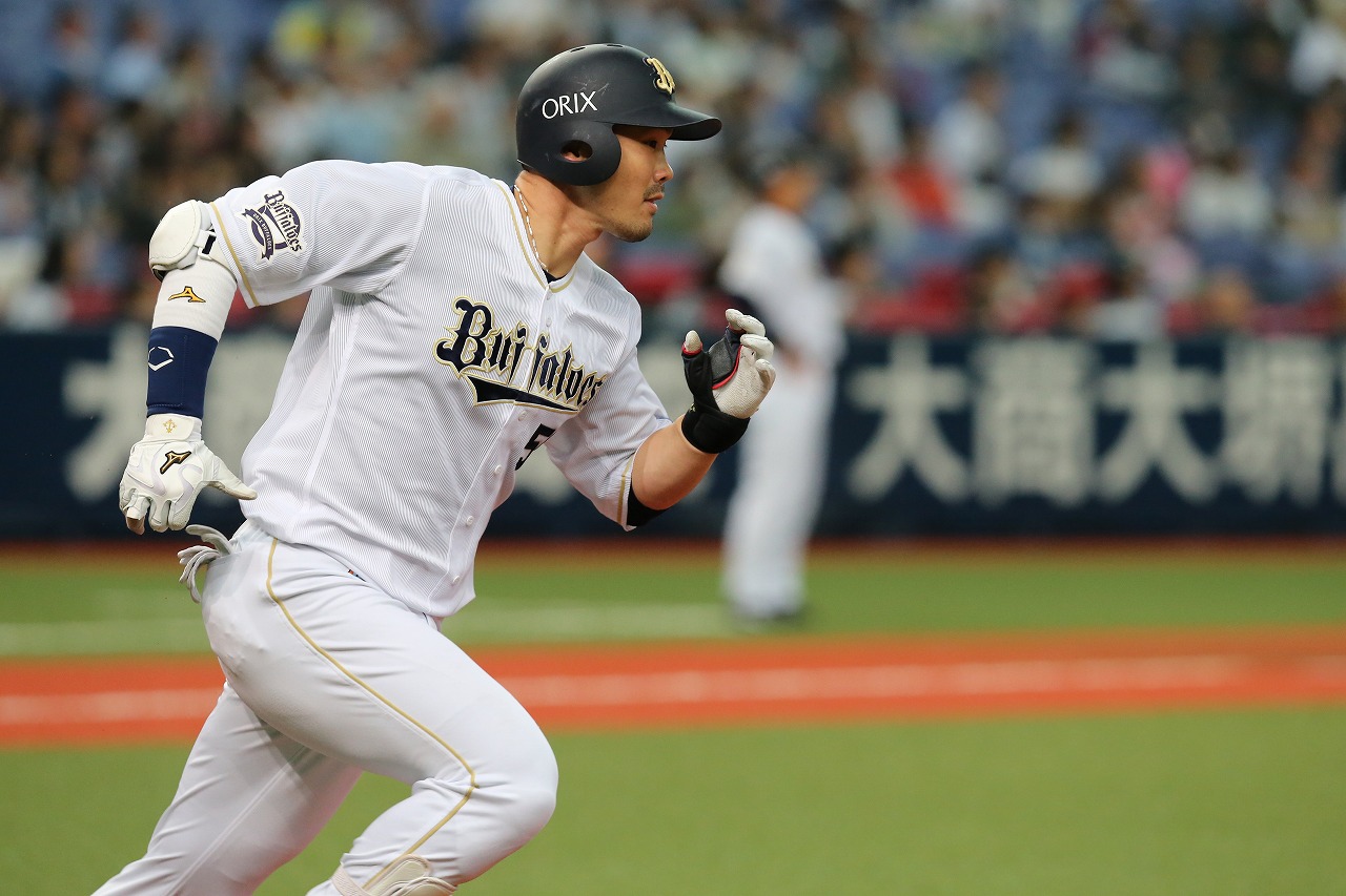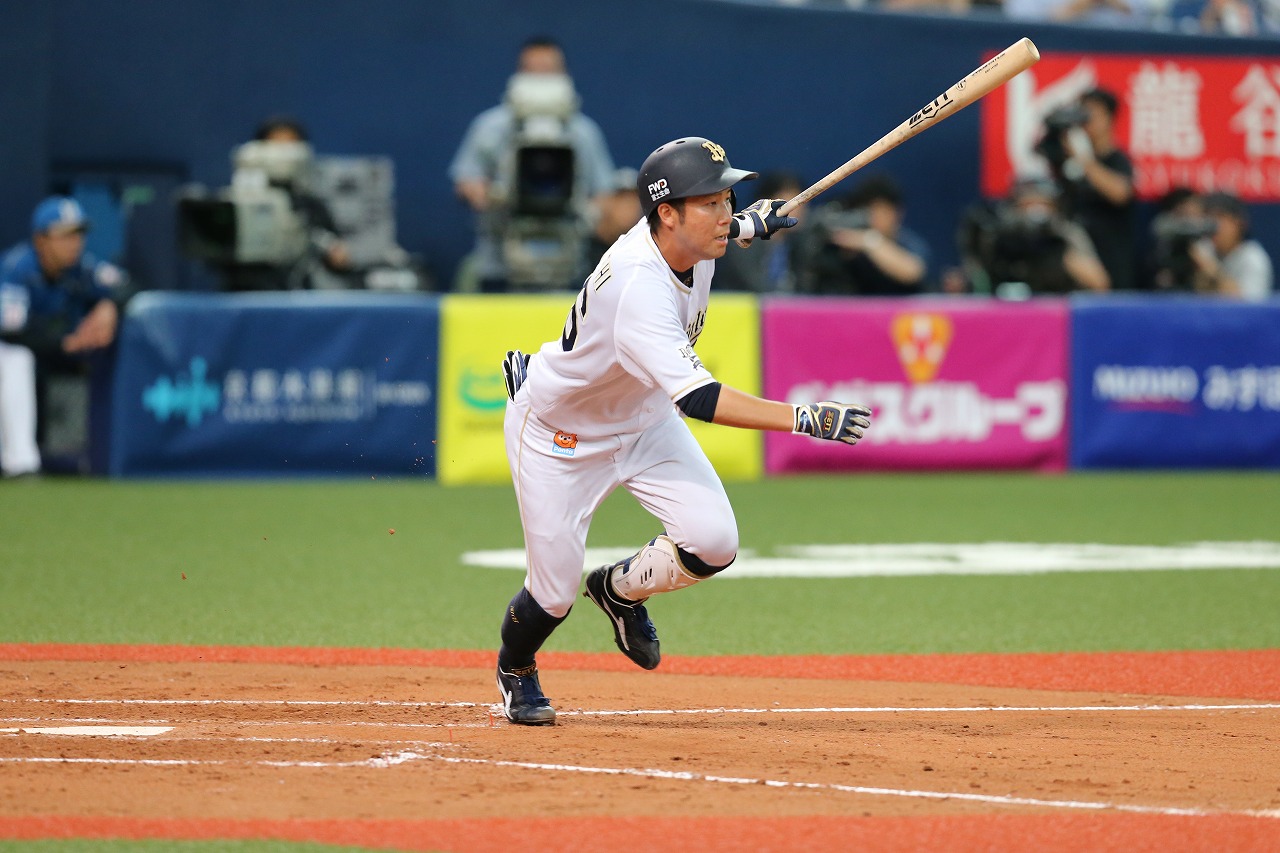 左中間への二塁打でチャンスを作ったT-岡田選手!
