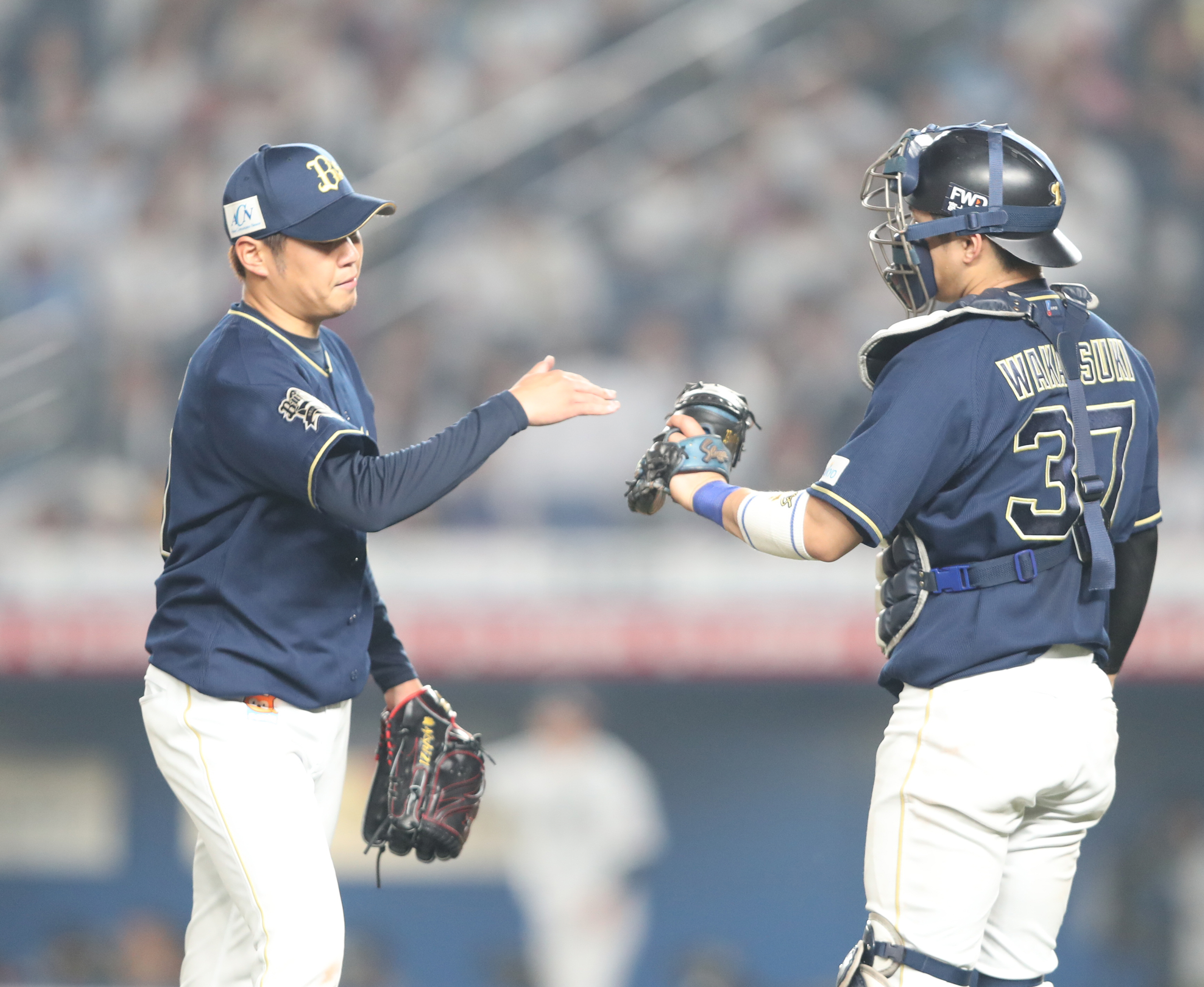 この回を3者凡退に抑えて若月選手とタッチする西投手!