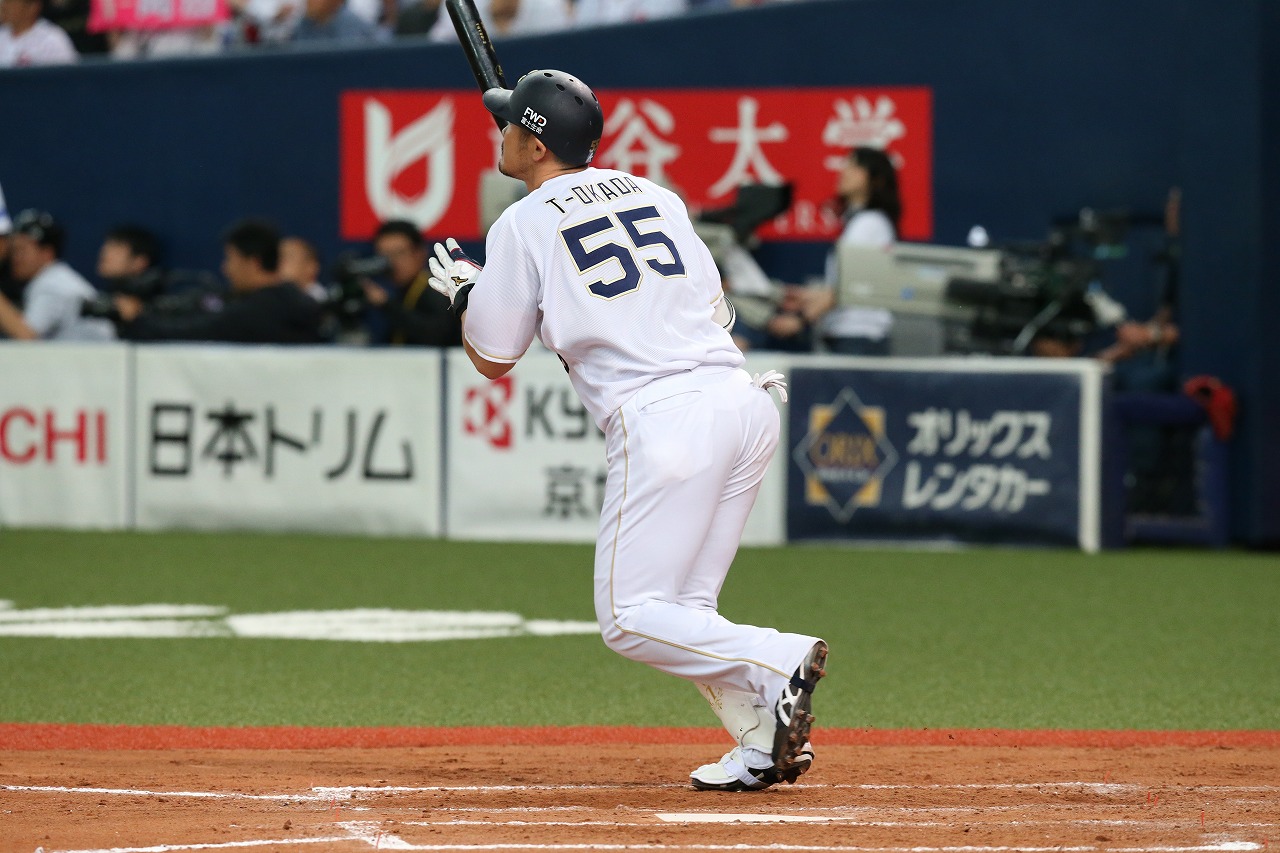 ライトスタンドへ同点3ランホームランを放ったT-岡田選手!