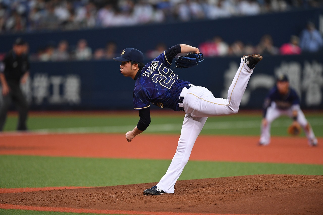 投手 田嶋 4番 柳田 空三振 外角低めのカットボールを空振り三振 1アウト  |