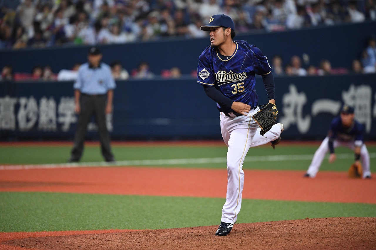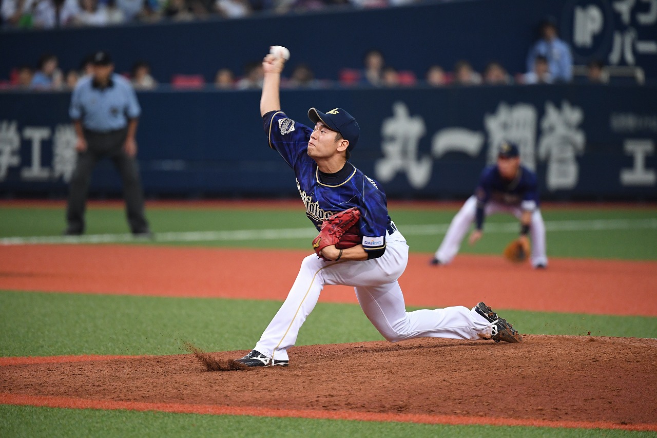 投手 有原 4番 吉田正 空三振 外角低めのチェンジアップを空振り三振 1アウト |