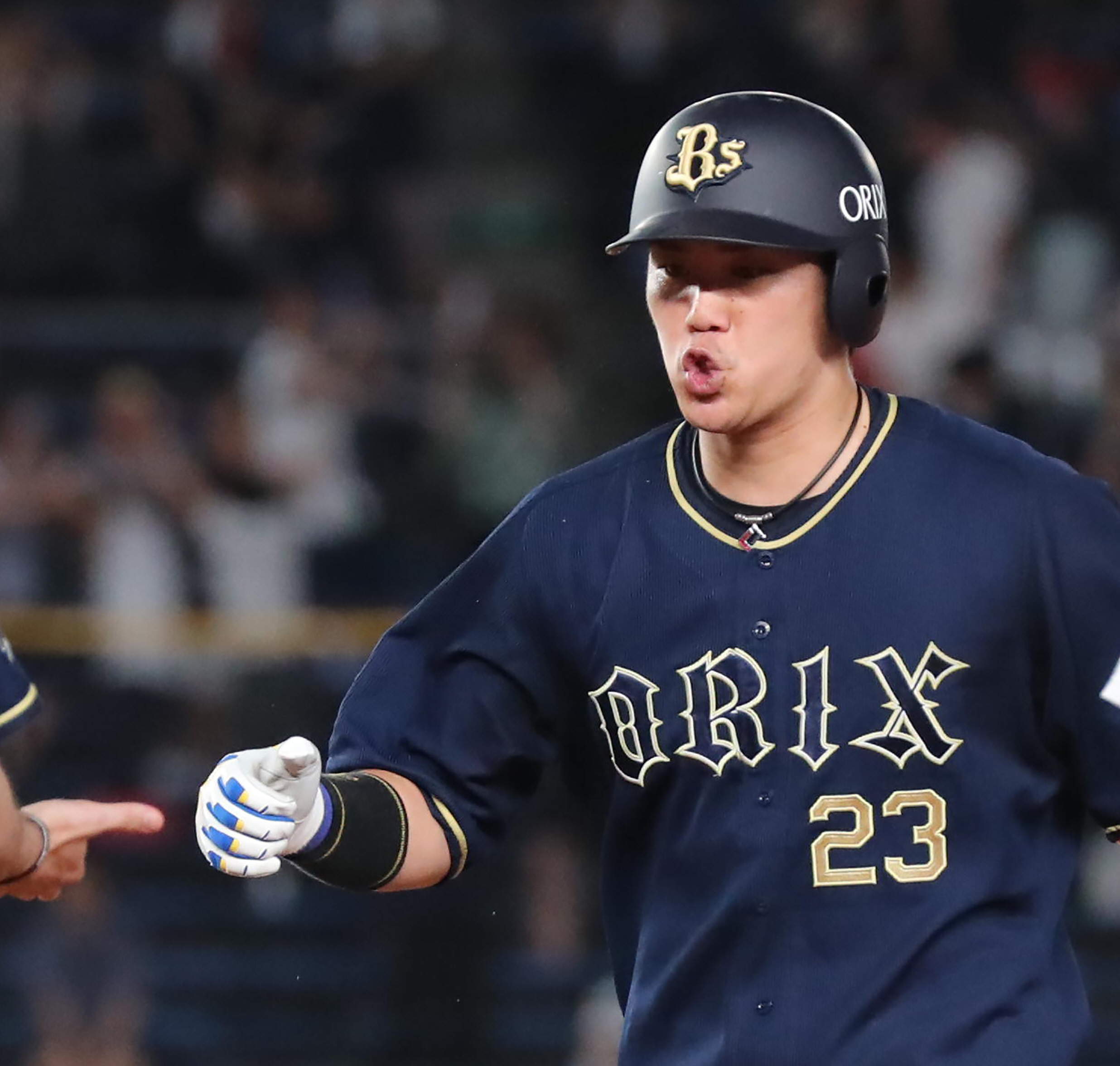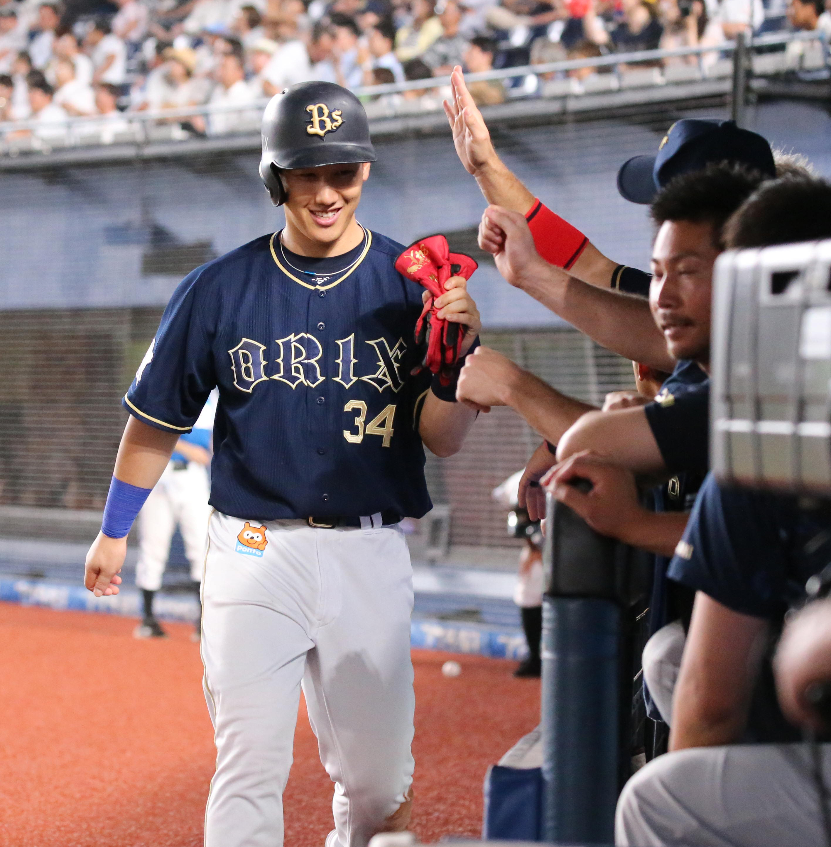 安達選手の犠飛で生還し出迎えを受ける吉田正選手