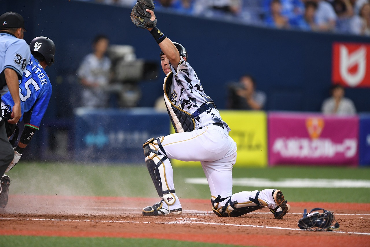 本塁へ突入してきた3塁走者をアウトにした若月選手!