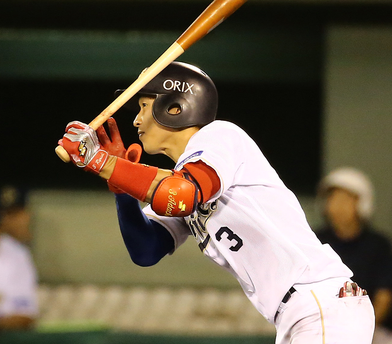 この回のトップバッターとしてセンターへヒットを放った安達選手!