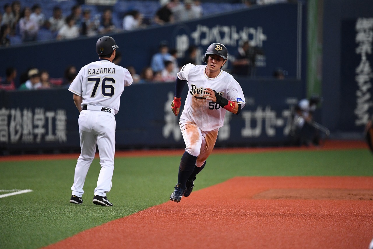 投手 加藤 4番 吉田正 左安 外角のストレートをレフトへ打ってヒット 1塁 |