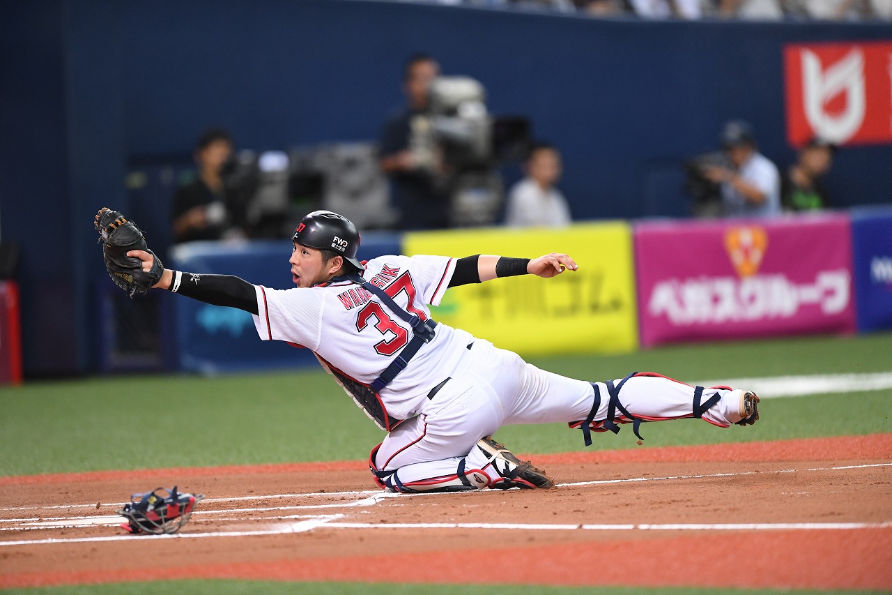 小田選手からの好返球で3塁走者をタッチアウトにした若月選手!