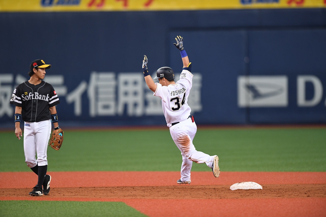 2打席連続の長打となるフェンスダイレクトのサヨナラ2ベースヒットを放った吉田正選手!