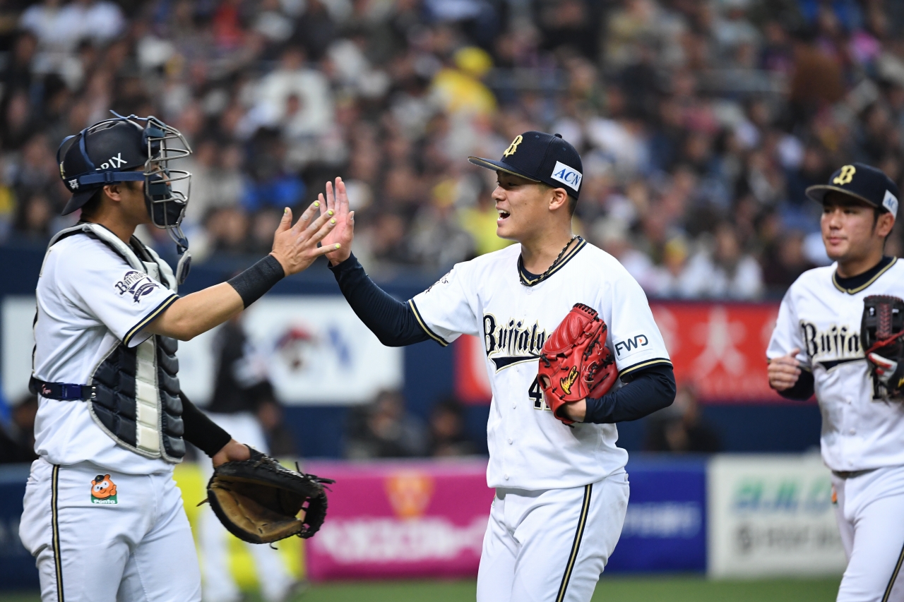 ピンチを切り抜けハイタッチする山本投手と若月選手!
