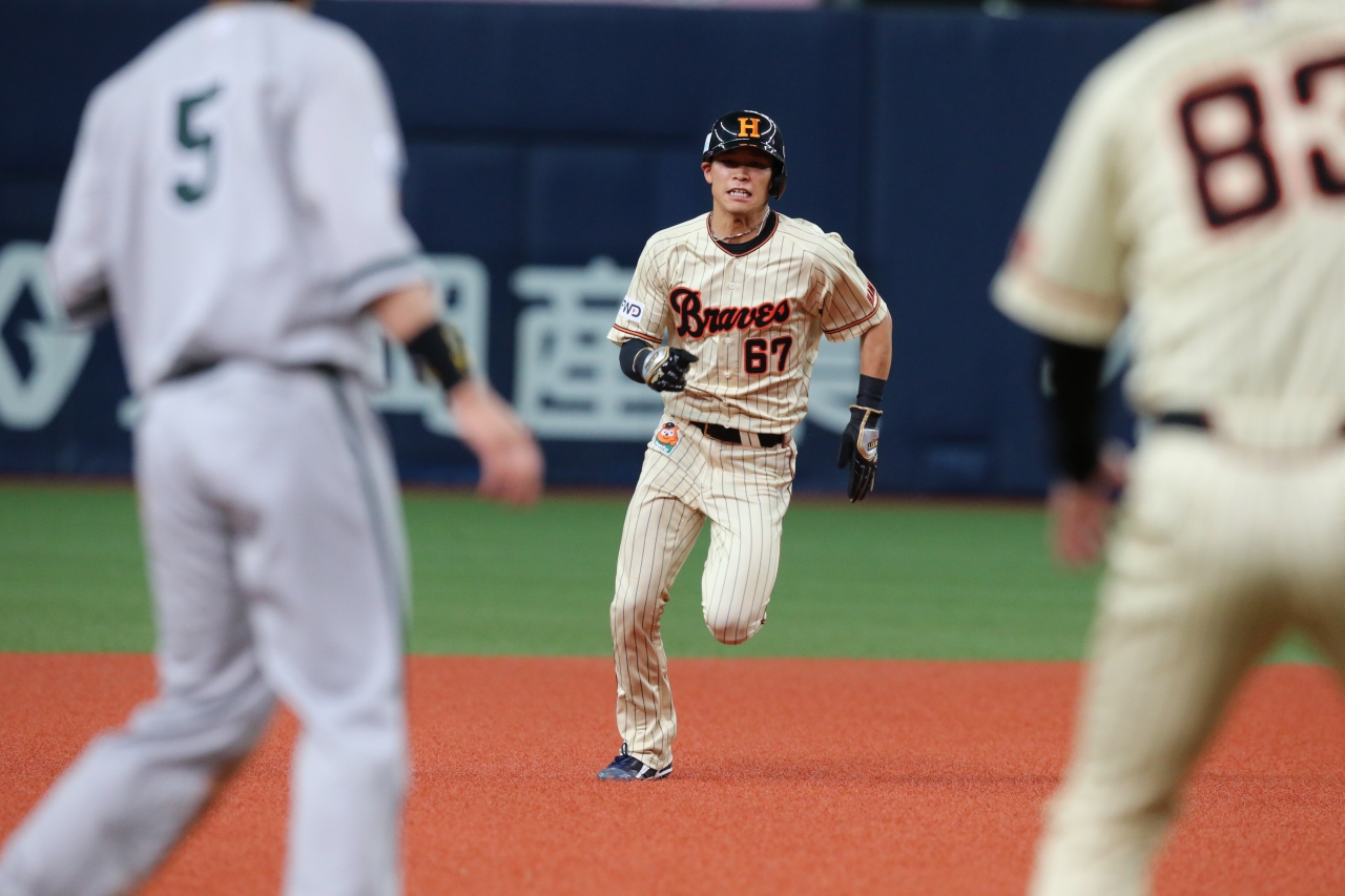 白崎選手のヒットで3塁へ向かう中川選手!