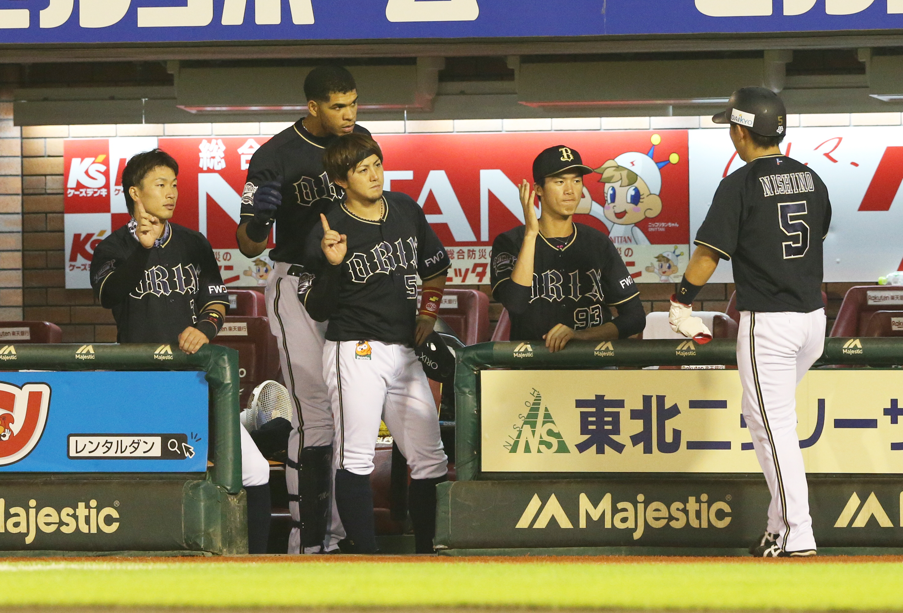 吉田正選手の一打で生還し、歓迎される西野選手!