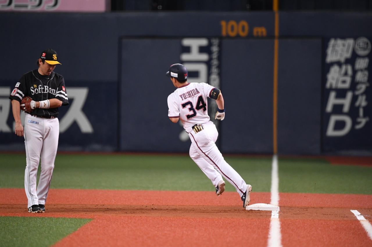 3番 吉田正 四球 フォアボールを選ぶ 1塁 |