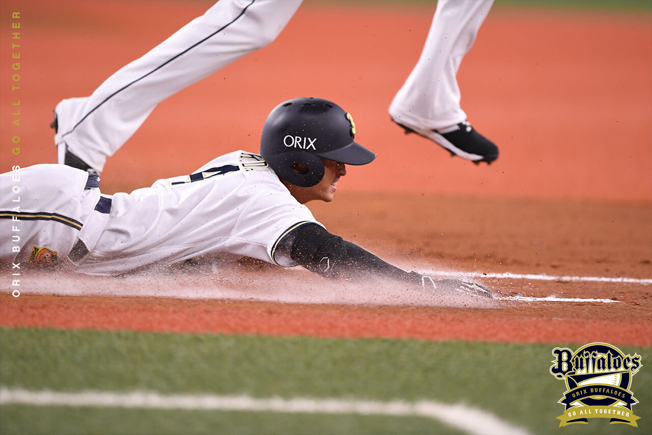 渾身のヘッドスライディングでヒットをもぎ取った福田選手!