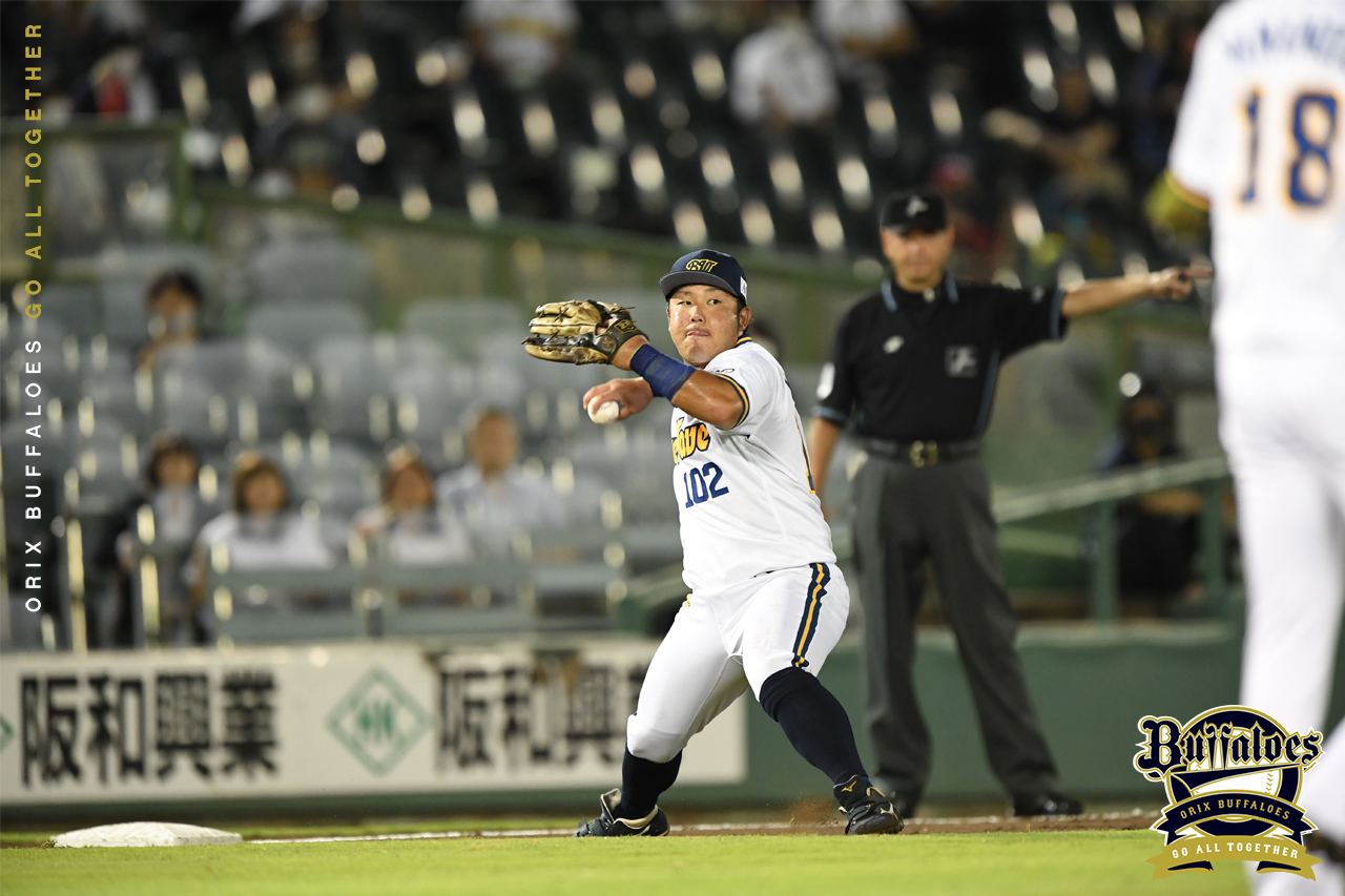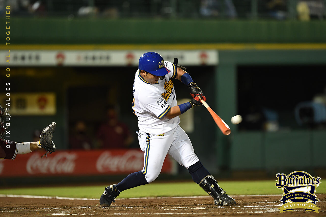 7番 松井佑 右安 ランナー2,3塁 高めのストレートをライトへ同点タイムリーヒット! 1,3塁 オ1-1楽 ![]() 1