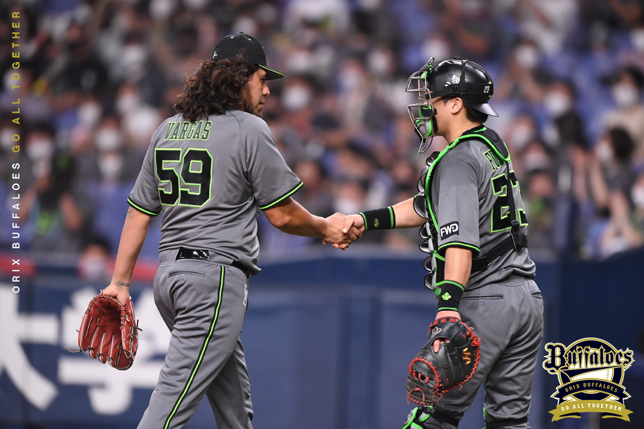 満塁のピンチを切り抜け、握手するバルガス投手と伏見選手!
