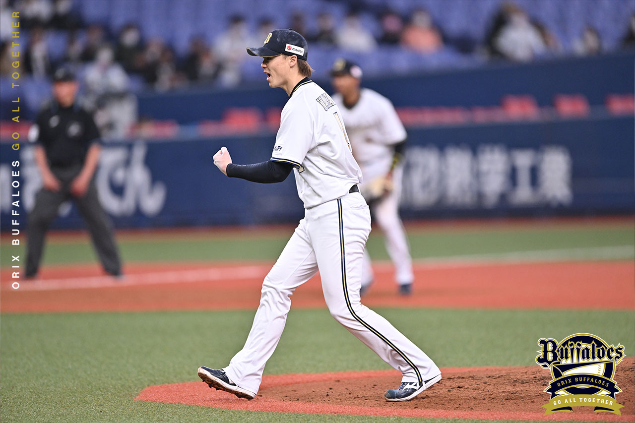 ピンチを凌ぎガッツポーズを見せる山崎福投手