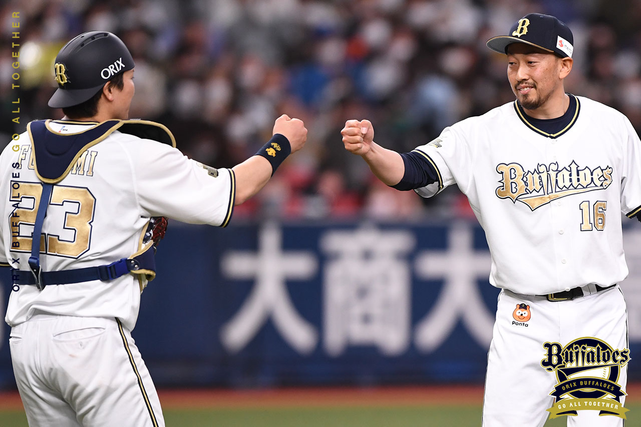 試合に勝利し平野佳投手と伏見捕手がグータッチ