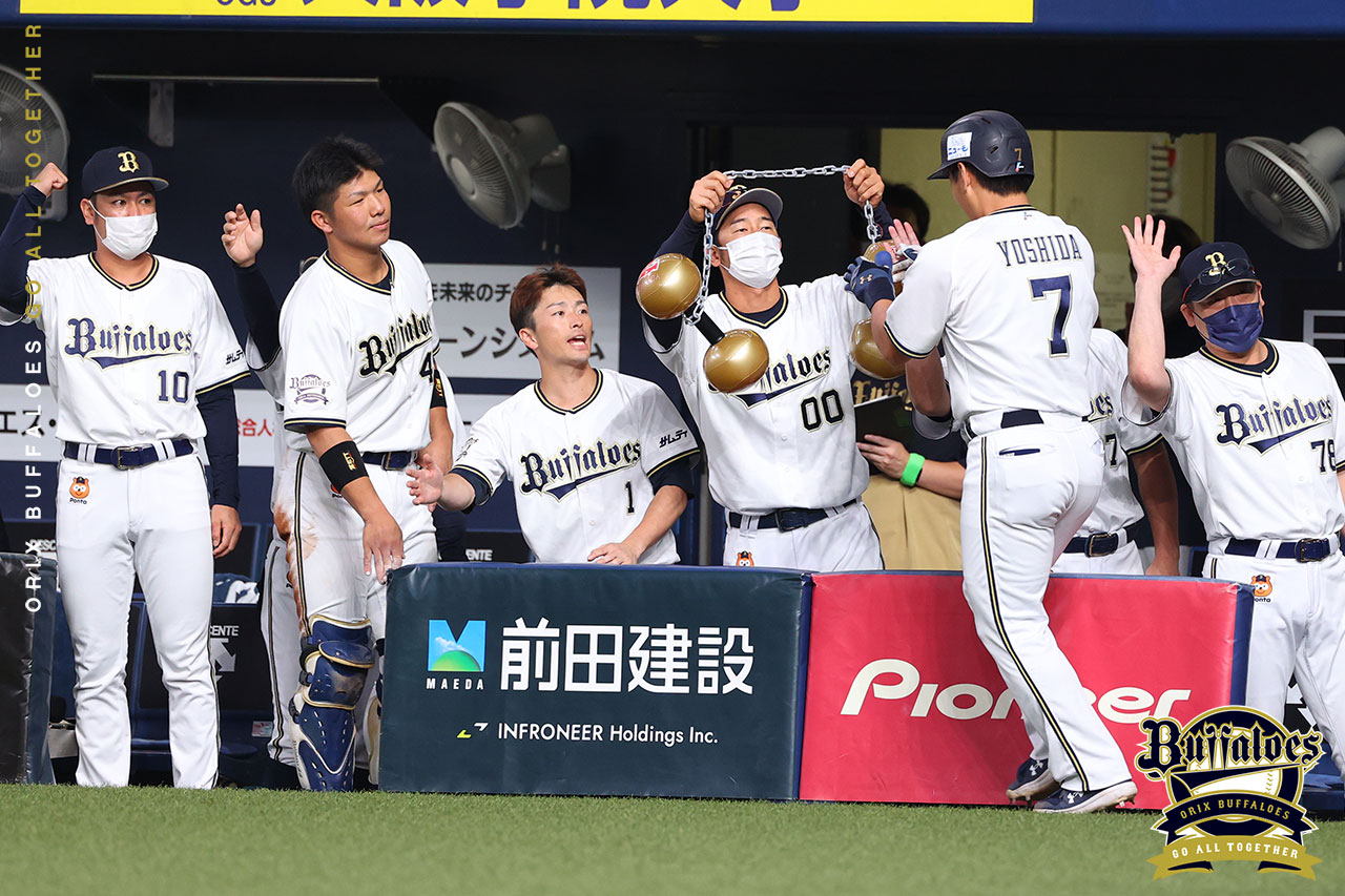 先制2ランを放ち、ベンチに迎えられる吉田正選手
