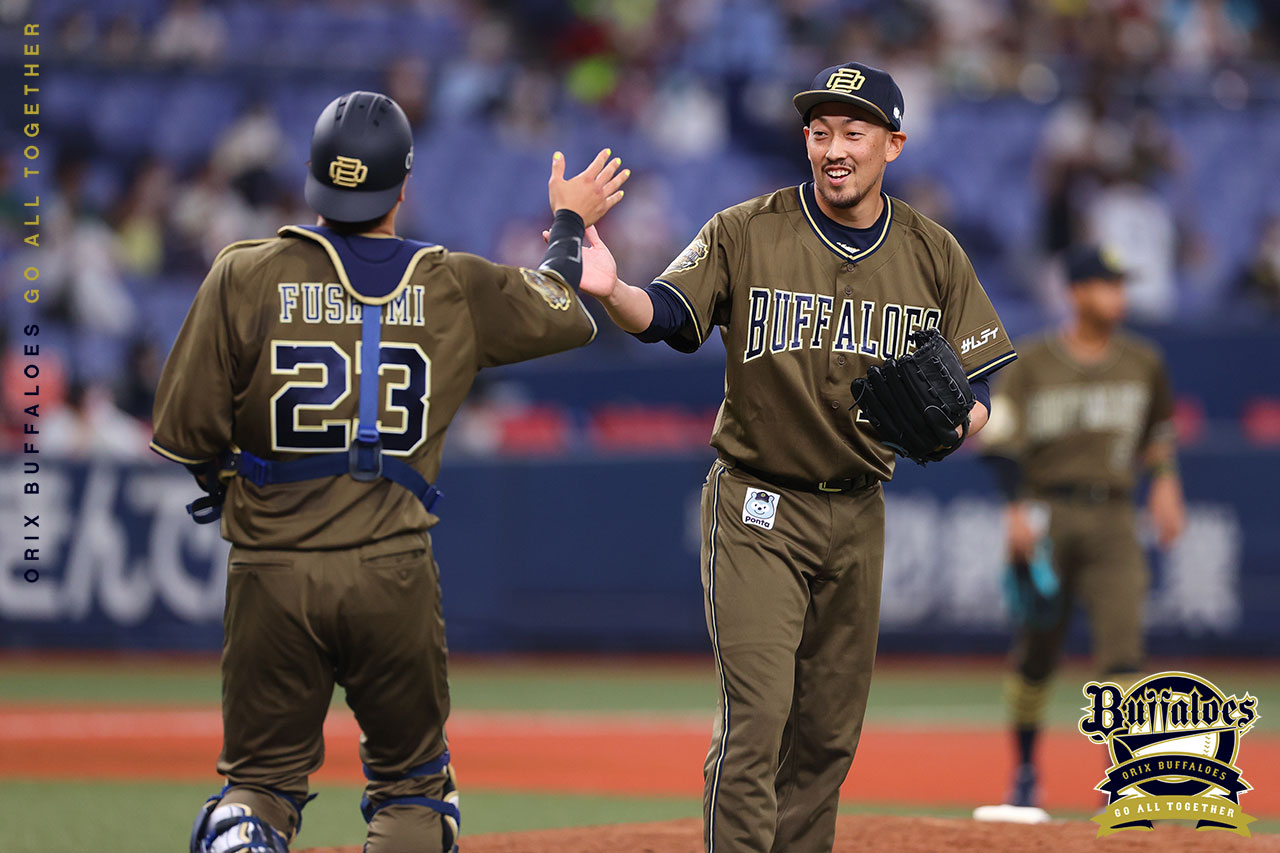 9回を無失点に抑え、伏見選手とハイタッチする平野佳投手