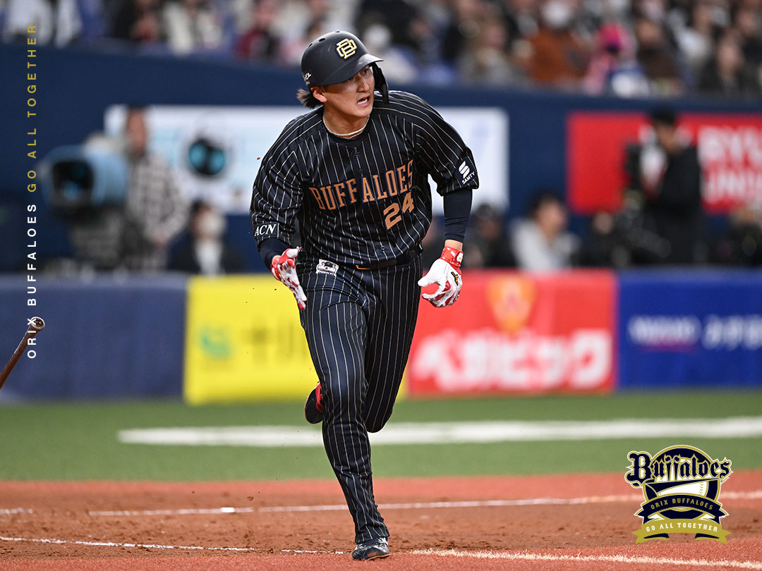 5番 紅林 左安 内角のカットボールをレフトへ打ってヒット 1塁  |