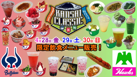 4月28日(金)~30日(日)「KANSAI CLASSIC 2017」にて、懐かしのグルメ「クラッシックメニュー」、近鉄バファローズカラーの赤と、南海ホークスカラーの緑を"食"でイメージした「赤メニューvs緑メニュー」、そして、両球団の「復刻版ヘルメットメニュー」を場内飲食売店等で販売いたします!!各メニューは数量限定販売ですので、この機会に、ぜひご賞味ください!