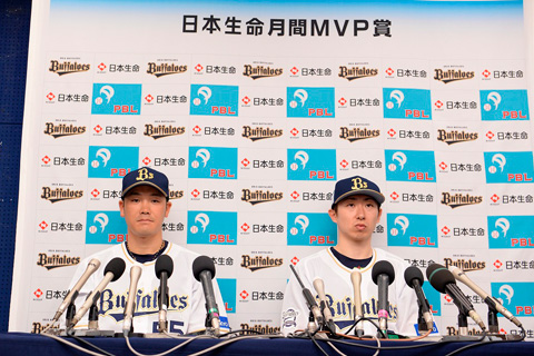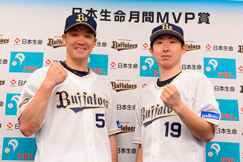 金子千尋投手とT-岡田選手が、3・4月度『日本生命月間MVP』をW受賞しました。