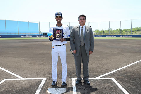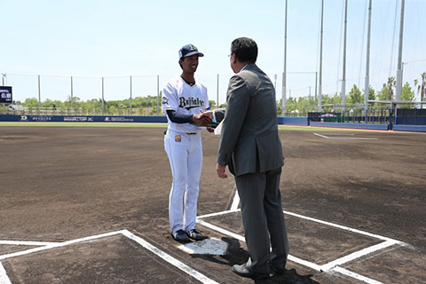 5月23日(火)舞洲サブ球場でのウエスタン・リーグ公式戦にて、3、4月度「スカパー!ファーム月間MVP賞」の受賞選手に選出された、宗 佑磨選手の表彰式が試合前に行われました。宗選手は、3、4月度のチームの全22試合に先発出場し、18試合で安打を記録。打率.322、安打28はいずれもリーグ3位の好成績で、4月を首位で終えたチームを牽引いたしました。