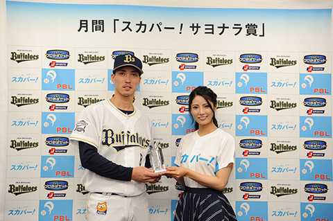 駿太選手が、5月度「スカパー!サヨナラ賞」を受賞しました!本日、京セラドーム大阪で受賞記者会見が行われ、スカパープロ野球PRアンバサダーの倉持明日香さんより記念のトロフィーとパネルが贈呈されました。