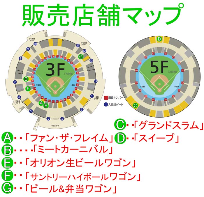| 販売場所 店舗名 | 場内3階(下段)3塁側 場内3階(下段)3塁側 場内5階(上段)3塁側 |