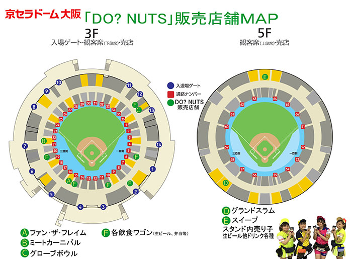 | (A)3階(下段)3塁側内野コンコース通路15横「ファン・ザ・フレイム」 (B)3階(下段)3塁側内野コンコース通路21横「ミートカーニバル」 (C)3階(下段)ライト側外野コンコース通路35前「グローブボウル」 (D)5階(上段)3塁側内野コンコース通路57付近「グローブボウル」 (E)5階(上段)センター側外野コンコース「スイープ」 (F)各飲食ワゴン(生ビール、弁当等) 3階(下段)3塁側内野コンコース通路15横オリオンビールワゴン 3階(下段)3塁側内野コンコース通路20横サントリーハイボールワゴン 3階(下段)ライト側外野コンコース通路35付近弁当ワゴン 3階(下段)1塁側内野コンコース通路5横アサヒスーパードライエクストラコールドワゴン 3階(下段)1塁側内野コンコース通路8前弁当ワゴン 3階(下段)1塁側内野コンコース通路10横スミノフワゴン スタンド内売り子(生ビール他ドリンク各種) ※外野チケットで内野エリアへの立ち入りはできません。 |