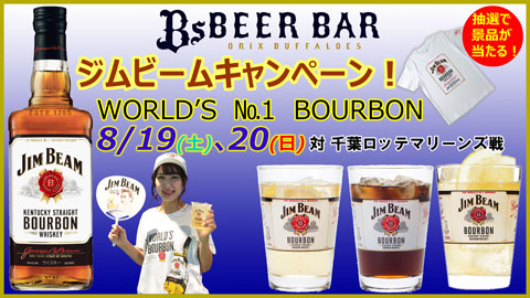 8月19日(土)・20日(日)対千葉ロッテマリーンズ戦にて、下段ライトスタンド後方の『Bs BEER BAR』にて、世界№1バーボンウイスキー「JIM BEAM(ジムビーム)」のキャンペーンを行ないます。