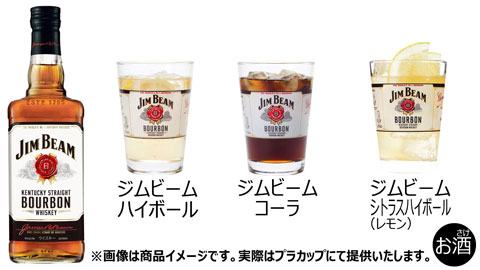 ・ジムビームハイボール 600円(税込み) ・ジムビームコーラ 600円(税込み) ・ジムビームシトラスハイボール(レモン) 600円(税込み) (注)各アルコール類です。 | ||