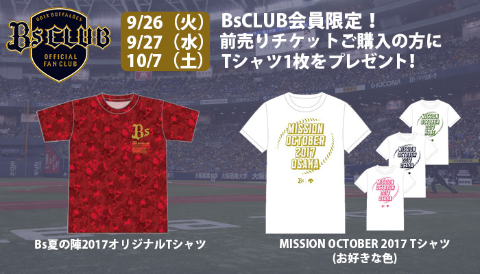 京セラドーム大阪で開催する9月26日(火)・27日(水)の北海道日本ハムファイターズ戦、および10月7日(土)の東北楽天ゴールデンイーグルス戦にて、前売りチケットをご購入のBsCLUB会員のみなさまに、「MISSION OCTOBER 2017 Tシャツ」もしくは「Bs夏の陣2017オリジナルTシャツ」のいずれかをチケット1枚につき1着プレゼントします。