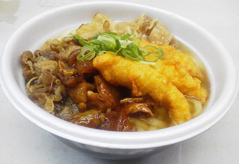 | 牛すじ、豚塩カルビ、鳥天をトッピングしたボリューム満点のうどんです! | |||
