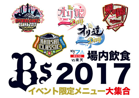 10月7日(土)の本拠地最終戦では、今シーズン場内飲食売店で販売された『Bsイベント限定メニュー』が大集合します!「開幕シリーズ」・「KANSAI CLASSIC」・「オリ達デー」・「オリ姫デー」・「Bs夏の陣2017」など、各イベント試合日に販売したメニューを多数取り揃えました。